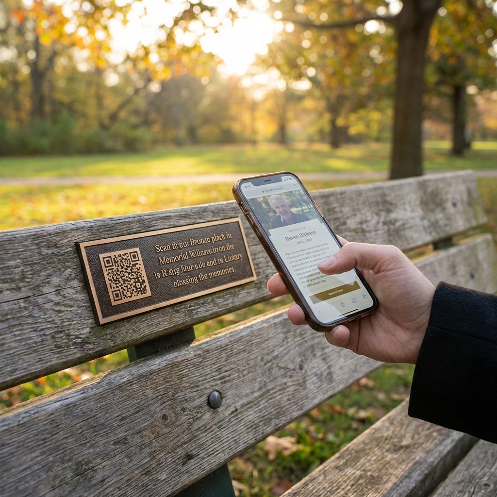 Attach a QR plaque to any physical memorial — benches, gates, trees, boulders.